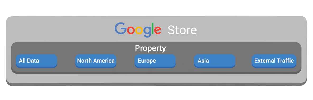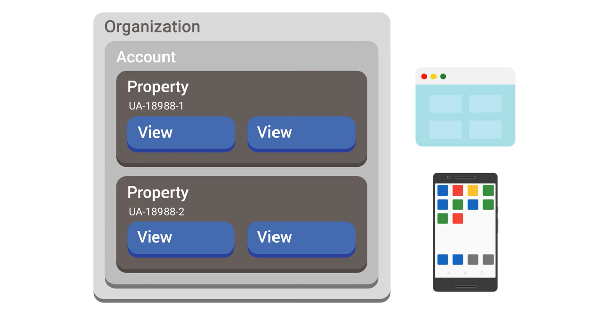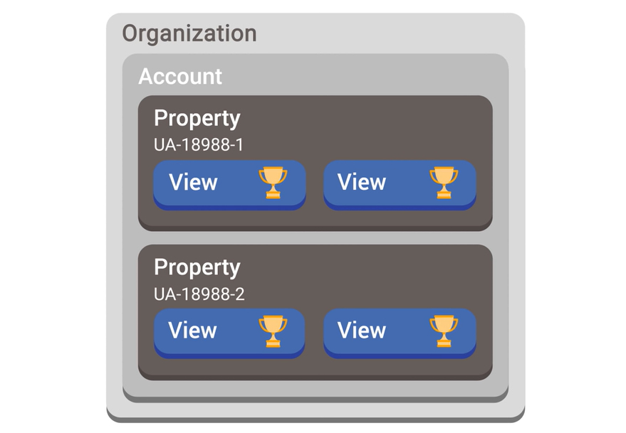 모든 Google 웹 로 분석 계정은 선택 사항인 '조직(Organization)'아래에 그룹화 할 수 있다. 이를 통해 하나의 그룹으로 여러 Google Analytics 계정을 관리 할 수 있다. 계정을 만들면 속성과 해당 속성 내에서 해당 계정에 대한 보기도 자동으로 생성된다. 그러나 각 애널리틱스 계정은 여러 속성(Property)을 가질 수 있고 각 속성은 여러 보기(View)를 가질 수 있다. 이를 통해 비즈니스를 가장 잘 반영하는 방식으로 Analytics 데이터 수집을 구성 할 수 있다.