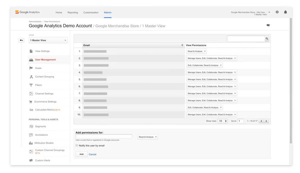 계정, 속성 또는 보기 단위로 다른 사용자에게 권한을 할당 할 수 있다. 각 단위는 상위 수준의 권한을 상속한다. (계정> 속성>보기) 예를 들어 계정에 대한 액세스 권한이 있는 경우 해당 계정 아래의 속성 및 보기에 대해 동일한 액세스 권한을 갖게된다. 그러나 보기에 대한 액세스 권한만 있는 경우 해당 보기와 연결된 속성 또는 계정을 수정할 수 있는 권한은 없다.